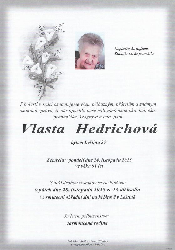 | Vlasta Hedrichová | 1934 | 24.11.2025 | Leština | s obřadem |