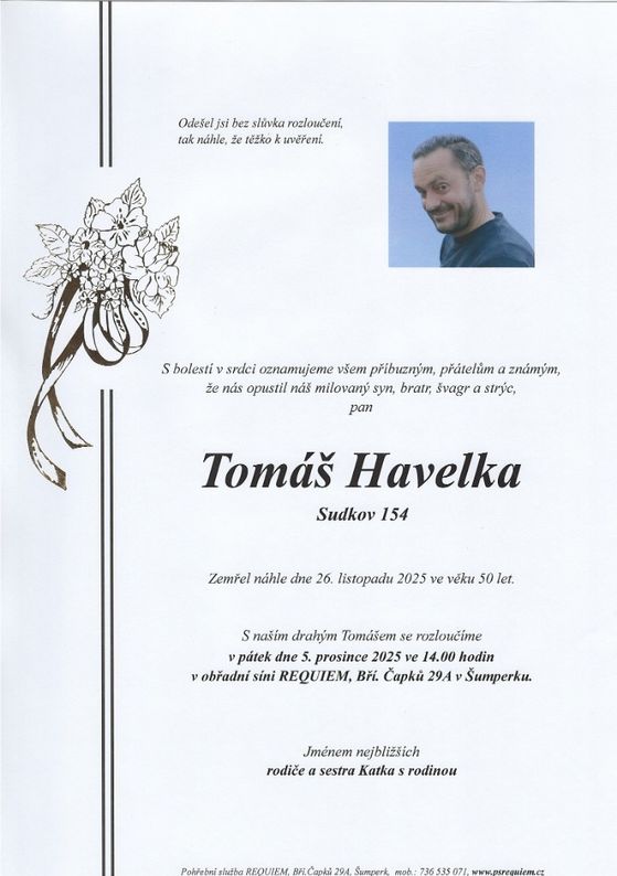 | Tomáš Havelka | 1975 | 26.11.2025 | Sudkov | s obřadem |