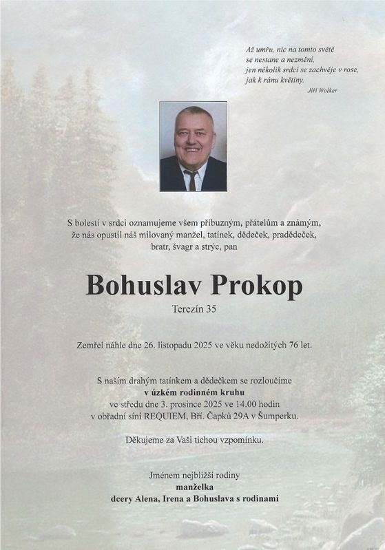 | Bohuslav Prokop | 1949 | 26.11.2025 | Terezín | bez obřadu |
