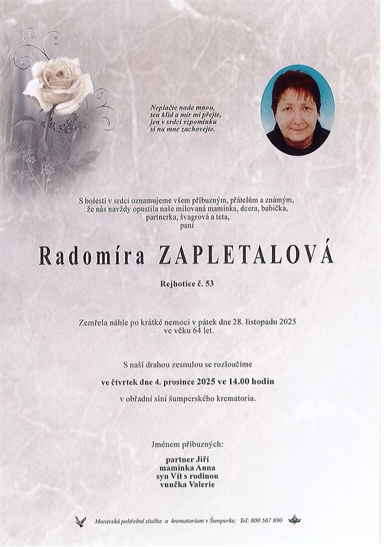 | Radomíra Zapletalová | 1961 | 28.11.2025 | Rejhotice | s obřadem |