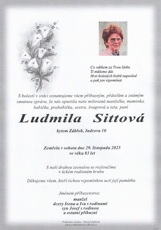 | Ludmila Sittová | 1942 | 29.11.2025 | Zábřeh | s obřadem |