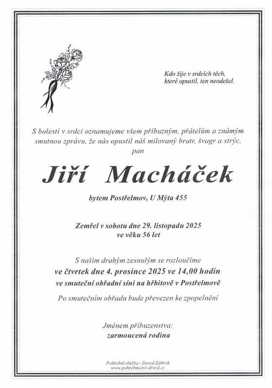 | Jiří Macháček | 1969 | 29.11.2025 | Postřelmov | s obřadem |