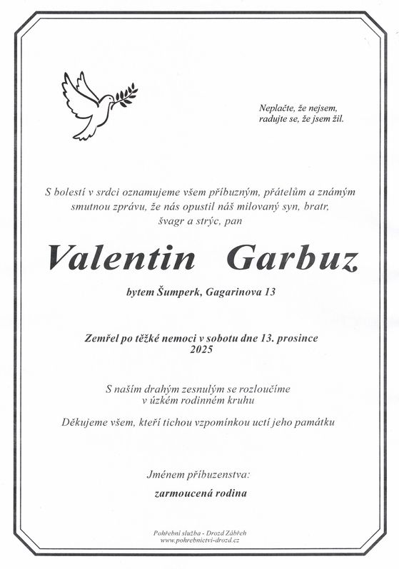 | Valentin Garbuz | 1970 | 13.12.2025 | Šumperk | bez obřadu |