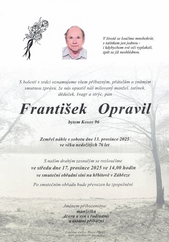 | František Opravil | 1950 | 13.12.2025 | Kosov | s obřadem |