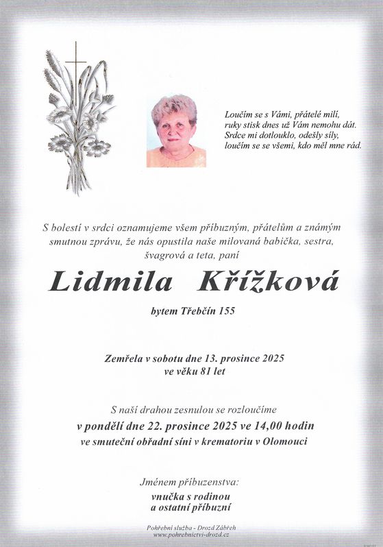 | Lidmila Křížková | 1944 | 13.12.2025 | Třebčín | s obřadem |