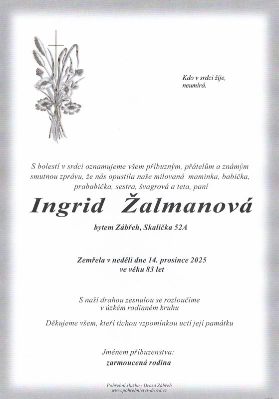 | Ingrid Žalmanová | 1942 | 14.12.2025 | Zábřeh | bez obřadu |