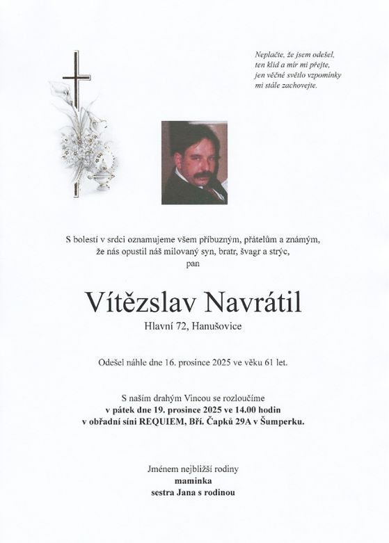 | Vítězslav Navrátil | 1964 | 16.12.2025 | Hanušovice | s obřadem |