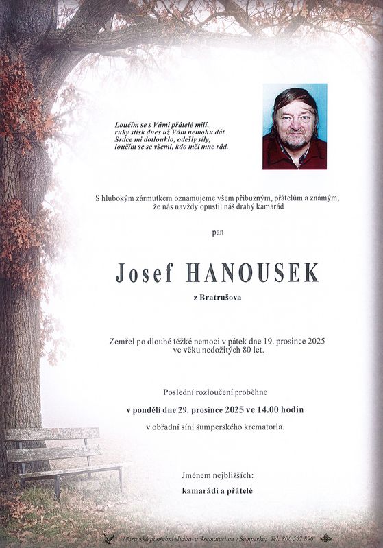 | Josef Hanousek | 1946 | 19.12.2025 | Bratrušov | s obřadem |