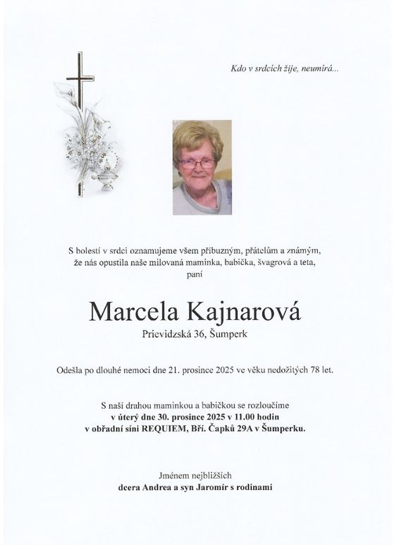 | Marcela Kajnarová | 1948 | 21.12.2025 | Šumperk | s obřadem |