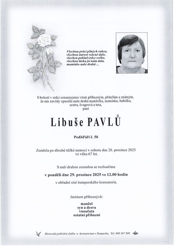 | Libuše Pavlů | 1958 | 20.12.2025 | Podžďáří | s obřadem |