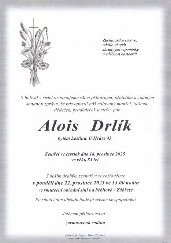 | Alois Drlík | 1942 | 18.12.2025 | Leština | s obřadem |