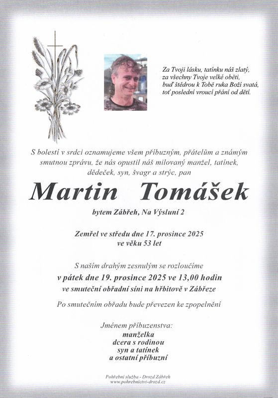 | Martin Tomášek | 1972 | 19.12.2025 | Zábřeh | s obřadem |