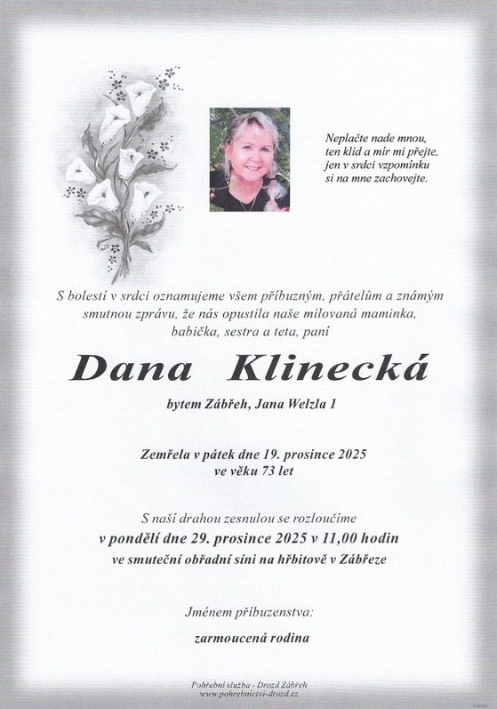| Dana Klinecká | 1952 | 19.12.2025 | Zábřeh | s obřadem |