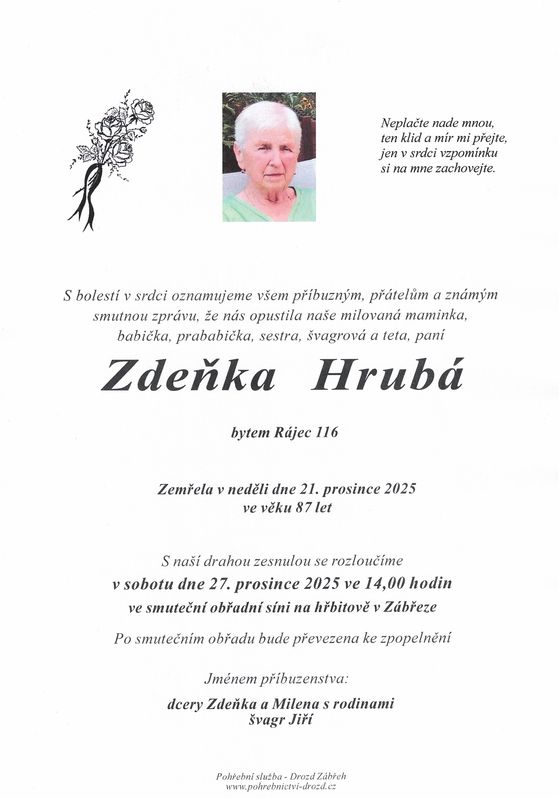 | Zdeňka Hrubá | 1938 | 21.12.2025 | Zábřeh | s obřadem |