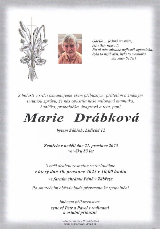 | Marie Drábková | 1942 | 21.12.2025 | Zábřeh | s obřadem |