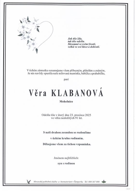 | Věra Klabanová | 1935 | 23.12.2025 | Mohelnice | s obřadem |