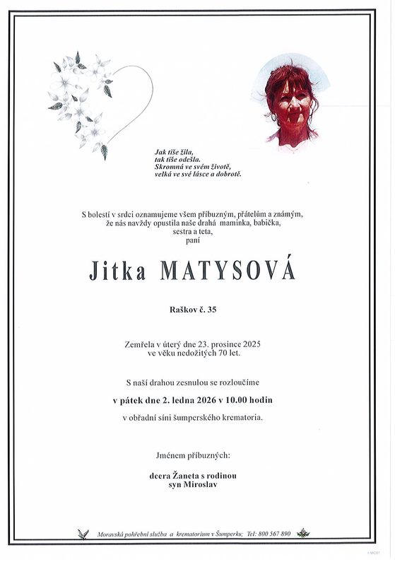 | Jitka Matysová | 1956 | 23.12.2025 | Raškov | s obřadem |
