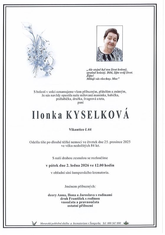 | Ilonka Kyselková | 1942 | 25.12.2025 | Vikantice | s obřadem |
