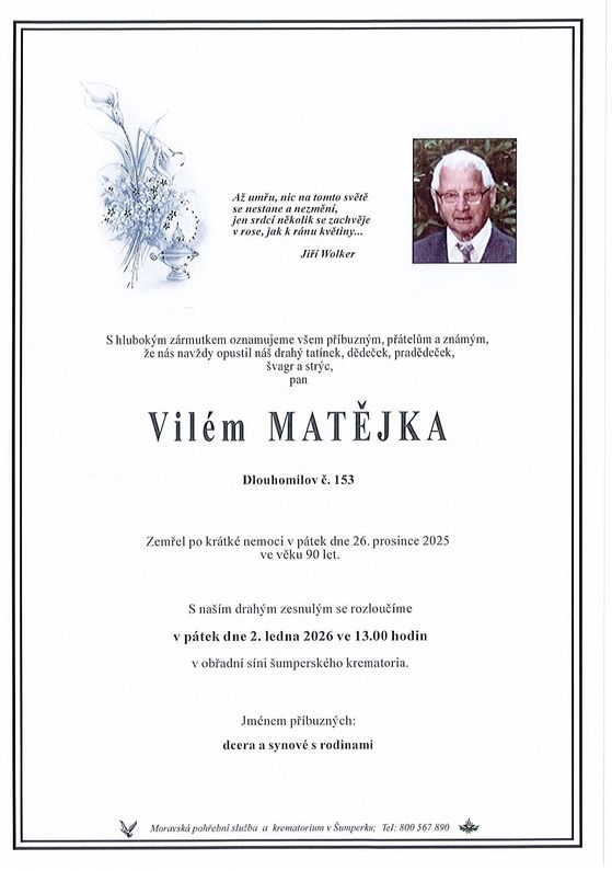 | Vilém Matějka | 1935 | 26.12.2025 | Dlouhomilov | s obřadem |