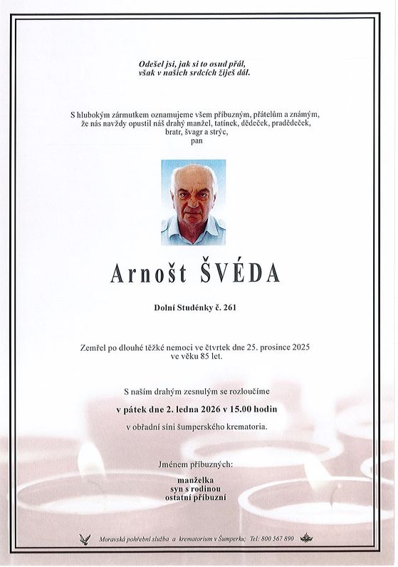 | Arnošt Švéda | 1940 | 25.12.2025 | Dolní Studénky | s obřadem |