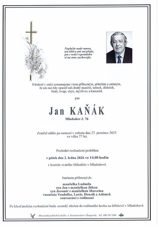 | Jan Kaňák | 1948 | 27.12.2025 | Mladoňov | s obřadem |
