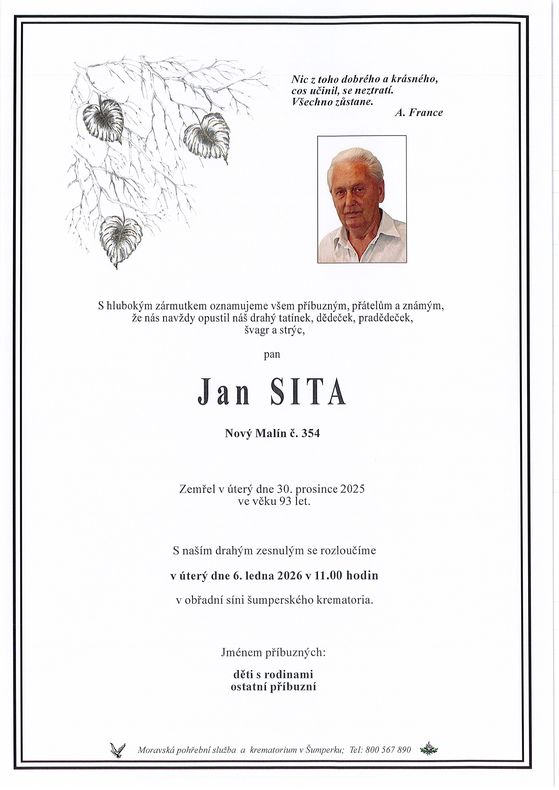 | Jan Sita | 1932 | 30.12.2025 | Nový Malín | s obřadem |